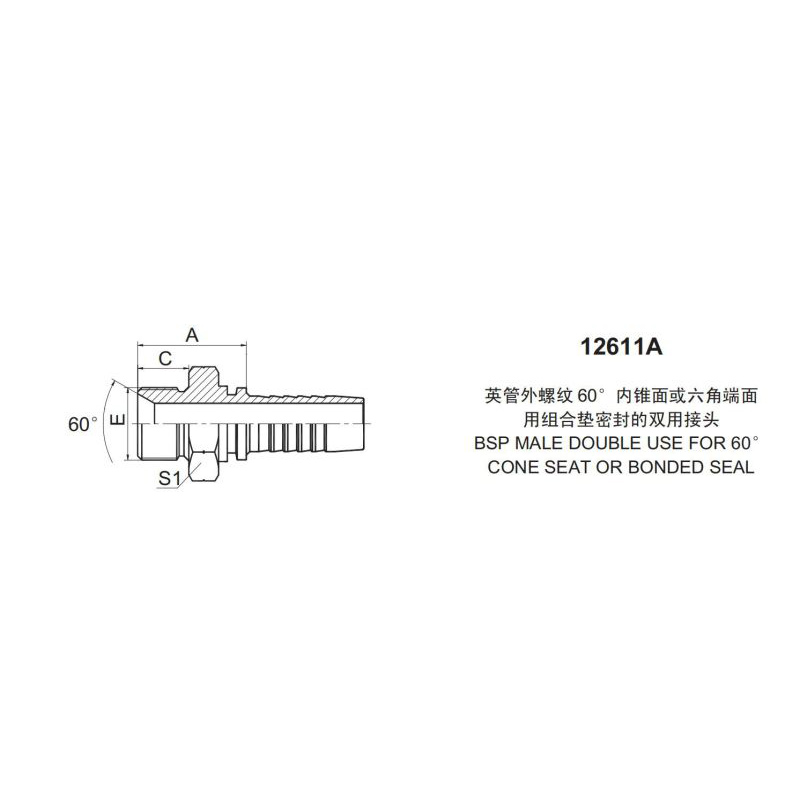 扣壓式接頭 12611A 英管外螺紋 60°內錐面或六角端面 用組合墊密封的雙用接頭